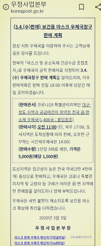(3.4.(수)판매) 보건용 마스크 우체국창구 판매 계획