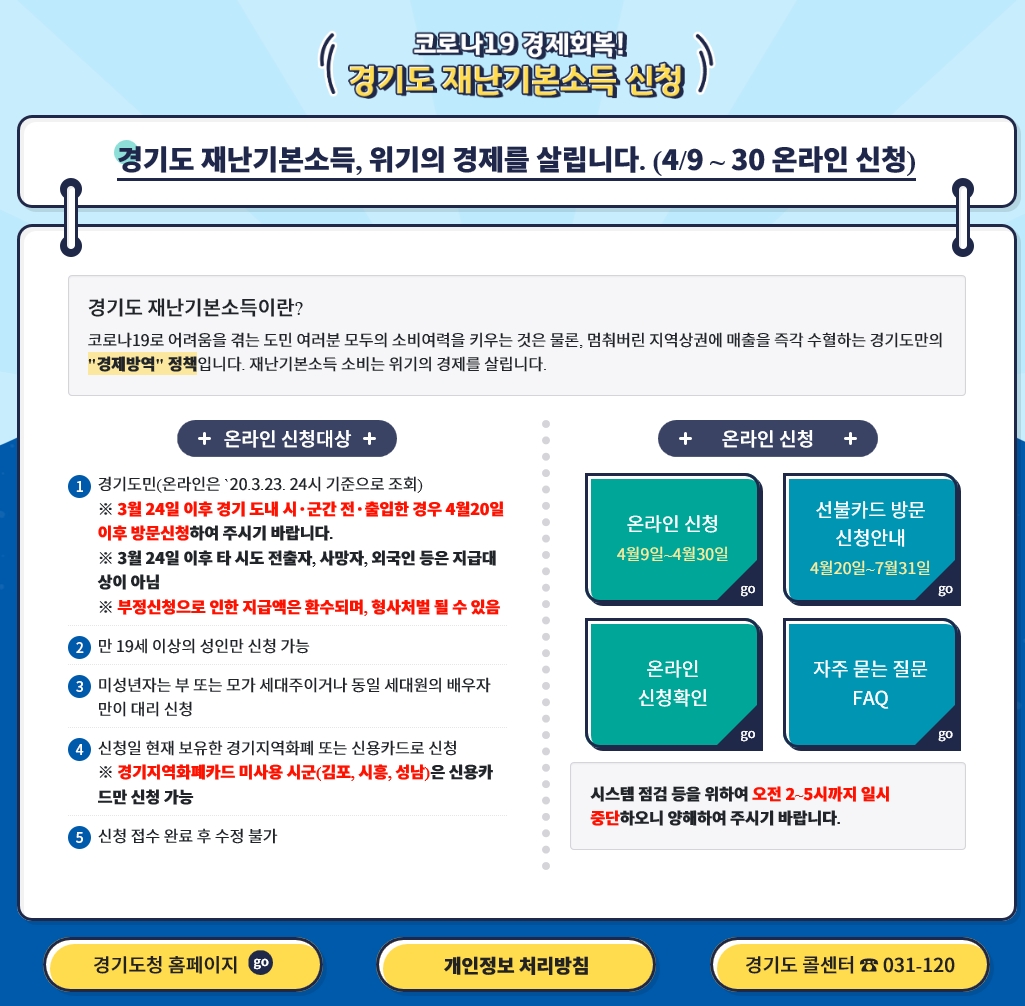 | 경기도 재난기본소득 신청 FAQ 2) 신청방법 / 공통사항 / 경기지역화폐카드 및 신용카드 방식 / 선불카드 방식 (0) | 2020.04.12 |