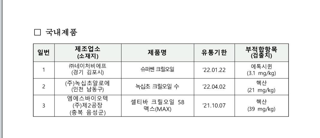 식약처, 유통 크릴오일 제품 검사 결과…49개 부적합 제품 리스트 식약처 퍼옴