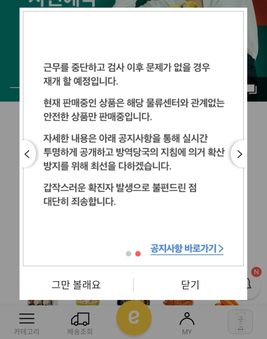또한, 코로나19 감염증 확산을 최소화하기 위하여 당사는 해당 배송기사와 밀접접촉 가능성이 있는 모든 직원에 대해 면밀히 검사를 진행할 예정입니다.