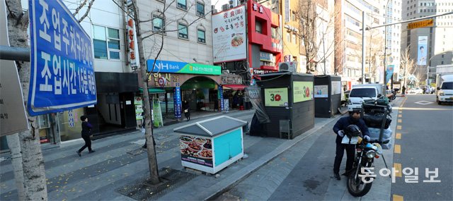 5일 오전 서울 중구 퇴계로 지하철 4호선 회현역 인근에 있는 오토바이 조업 주차구역에서 한 퀵서비스 기사가 오토바이를 대고 있다. 서울시는 화물차와 오토바이 등 배달 차량 운전자들이 불법 주정차를 하지 않고 안전하게 물건을 싣고 내릴 수 있도록 차로와 인도 사이에 별도의 주차공간을 만들어 지난해 5월부터 이용할 수 있게 했다. 전영한 기자 scoopjyh@donga.com