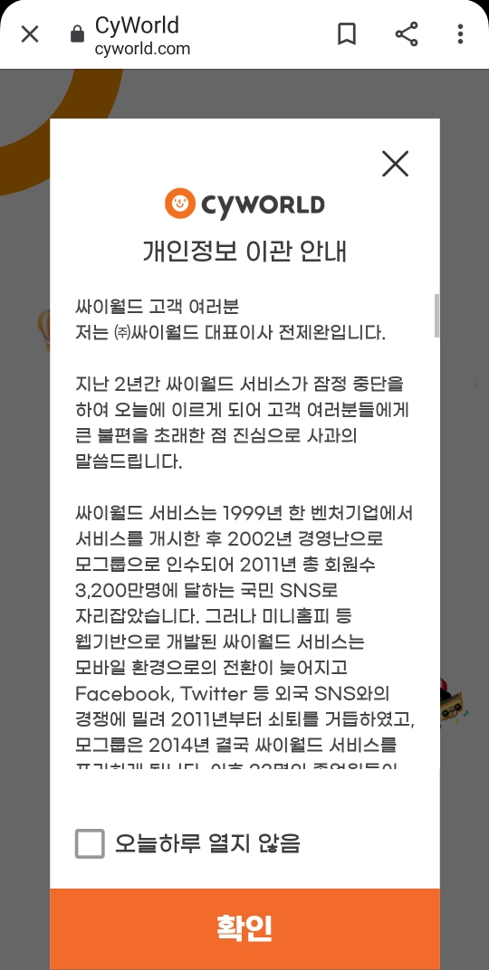 우리나라 “개인정보보호법”에 의하면 싸이월드 서비스의 운영주체(법인)이 바뀌게 되면 고객님들의 개인정보 이관 동의를 받는 절차가 있습니다. 오늘부터 그 절차를 진행하게 됩니다.