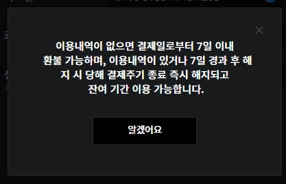 - 이용 기간이 종료되기 24시간 이내에 다음 이용에 대한 비용이 결제됩니다. 즉, 이용 기간 종료 시점으로부터 최소 23시간 전에 이용을 취소하지 않으시면 이용권이 자동으로 갱신됩니다.