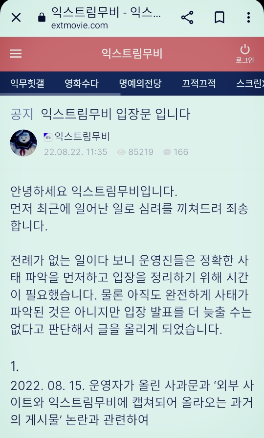 2022. 08. 15. 운영자가 올린 사과문과 ‘외부 사이트와 익스트림무비에 캡쳐되어 올라오는 과거의 게시물’ 논란과 관련하여