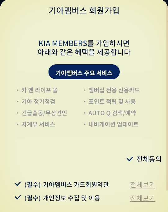 1.고객이 기아(주) 지점 · 대리점/AUTO Q(기아(주) 정비서비스 네트워크)/기아멤버스 웹사이트(https://members.kia.com)를 통하여 기아멤버스 회원가입을 신청하면 기아(주)는 자체 기준에 따른 심사를 거친 뒤 동 기준을 만족하는 고객에게 기아멤버스 회원의 자격을 부여합니다.
