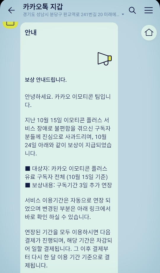 지난 10월 15일 이모티콘 플러스 서비스 장애로 불편함을 겪으신 구독자분들께 진심으로 사과드리며, 10월 24일 아래와 같이 보상이 지급되었습니다.