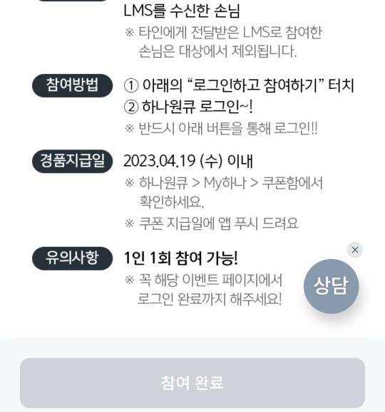 ◈ 이벤트 대상 : 본 문자를 하나은행으로부터 수신한 후 이벤트 페이지에서 로그인 완료한 손님 (1인1회 참여 가능)
