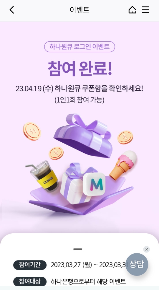 ※ 쿠폰 확인 : 하나원큐>My하나>쿠폰함