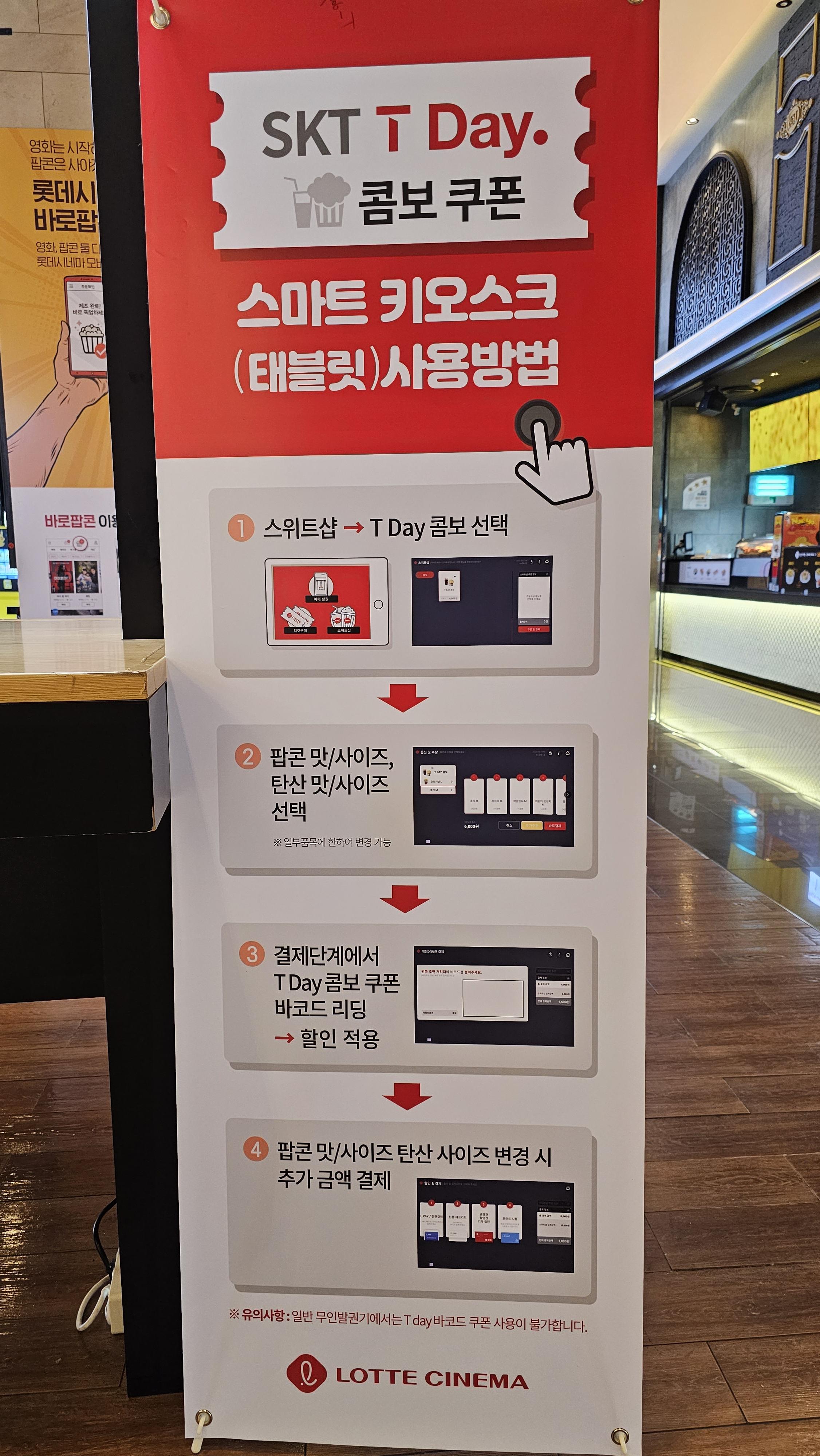 * 스마트 키오스크(태블릿) 사용 방법: 키오스크 화면 > 스위트샵 > 콤보 > T day 콤보 선택 > 쿠폰 바코드 인식 > 결제