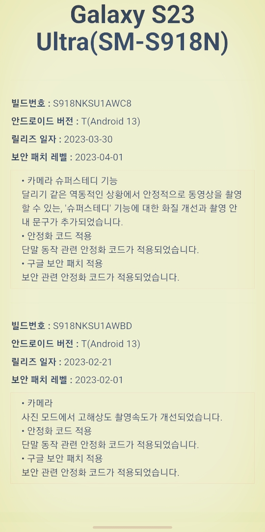 삼성 Galaxy S23 Ultra(SM-S918N) 소프트웨어 업데이트 2023.03.30