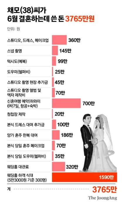 예식 당일도 부담이지만 준비하는 과정도 만만찮았다. 예비 신랑신부 필수 코스인 ‘스드메(스튜디오·드레스·메이크업)’에 360만원을 썼다. 스냅·스튜디오 촬영, 앨범 제작에 190만원이 들어갔다. 촬영 당일 옵션(선택사항)을 주문했더니 45만원을 추가로 내야했다. 미국 하와이로 떠나는 신혼여행(6박 7일 항공료+숙박비)을 예약하는 데 700만원을 썼다. 고민 끝에 예물은 생략했다. 채씨는 “결혼하기까지 들어간 비용을 따져보니 3765만원이었다”며 “그나마 1년 전부터 이곳저곳 비교해가며 준비한 덕분에 ‘선방’했다”고 말했다.