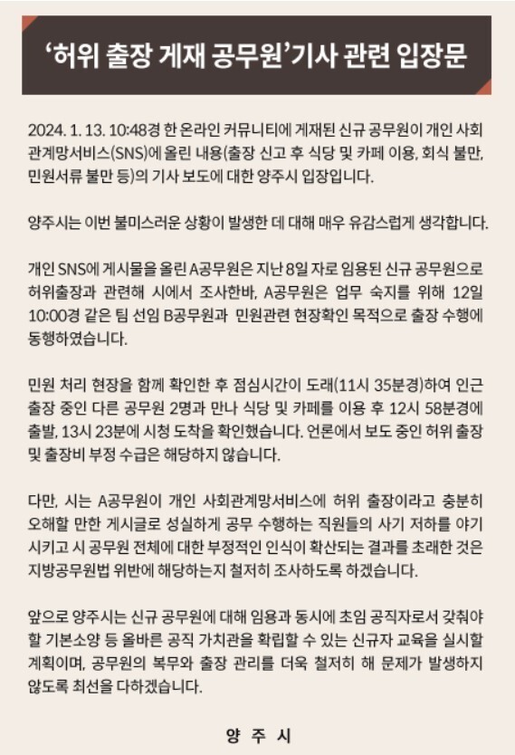 15일 양주시청 누리집에 올라온 9급 공무원 개인 사회관계망서비스(SNS) 논란 관련 입장문.