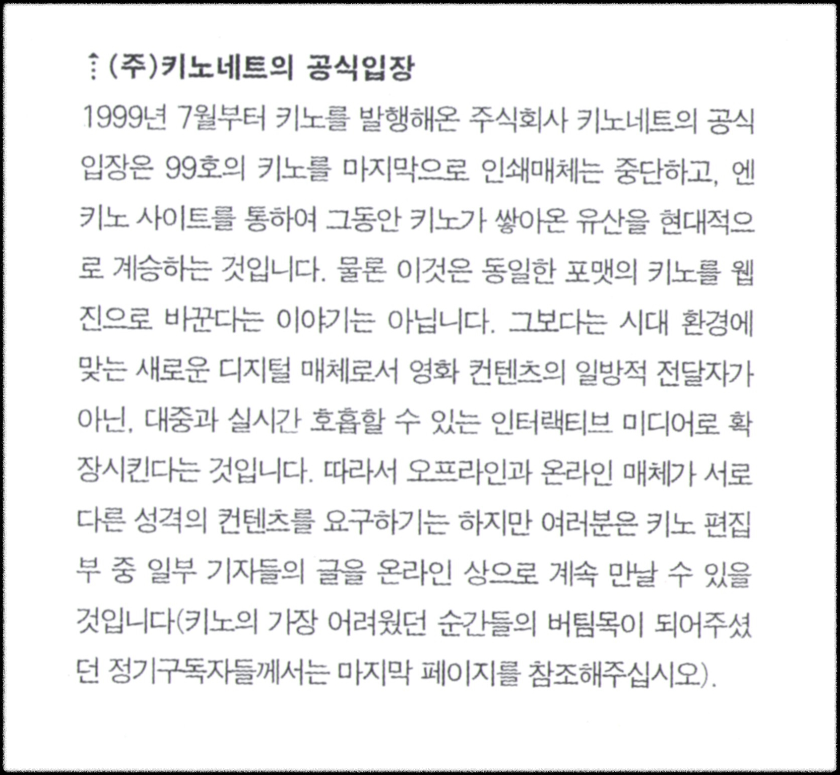 : (주)키노네트의 공식입장 1999년 7월부터 키노를 발행해온 주식회사 키노네트의 공식 입장은 99호의 키노를 마지막으로 인쇄매체는 중단하고, 엔 키노 사이트를 통하여 그동안 키노가 쌓아온 유산을 현대적으 로 계승하는 것입니다. 물론 이것은 동일한 포맷의 키노를 웹 진으로 바꾼다는 이야기는 아닙니다. 그보다는 시대 환경에 맞는 새로운 디지털 매체로서 영화 컨텐츠의 일방적 전달자가 아닌, 대중과 실시간 호흡할 수 있는 인터랙티브 미디어로 확 장시킨다는 것입니다. 따라서 오프라인과 온라인 매체가 서로 다른 성격의 컨텐츠를 요구하기는 하지만 여러분은 키노 편집 부 중 일부 기자들의 글을 온라인 상으로 계속 만날 수 있을 것입니다(키노의 가장 어려웠던 순간들의 버팀목이 되어주셨 던 정기구독자들께서는 마지막 페이지를 참조해주십시오).