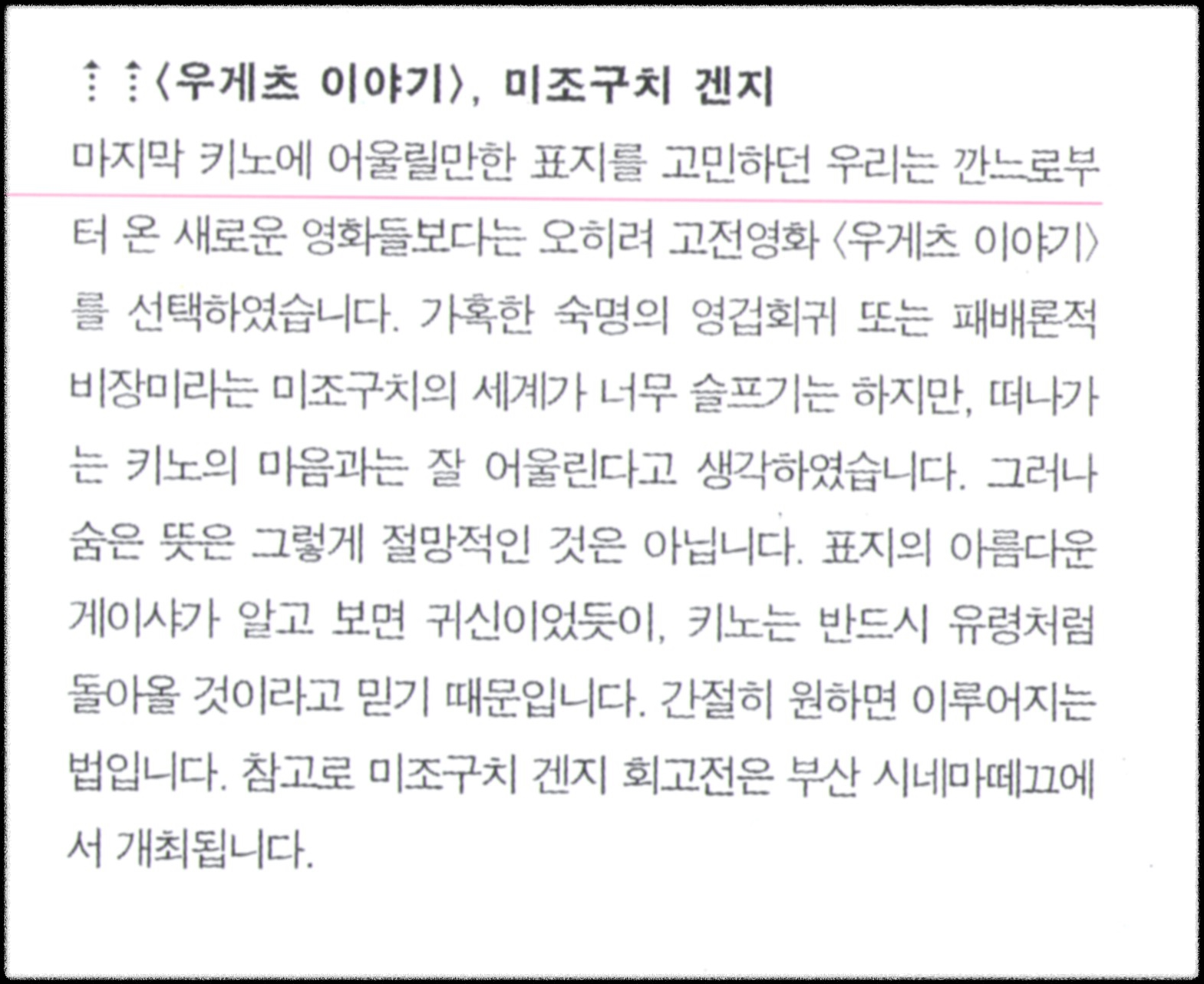 마지막 키노에 어울릴만한 표지를 고민하던 우리는 깐느로부 터 온 새로운 영화들보다는 오히려 고전영화 <우게츠 이야기> 를 선택하였습니다. 가혹한 숙명의 영겁회귀 또는 패배론적 비장미라는 미조구치의 세계가 너무 슬프기는 하지만, 떠나가 는 키노의 마음과는 잘 어울린다고 생각하였습니다. 그러나 숨은 뜻은 그렇게 절망적인 것은 아닙니다. 표지의 아름다운 게이샤가 알고 보면 귀신이었듯이, 키노는 반드시 유령처럼 돌아올 것이라고 믿기 때문입니다. 간절히 원하면 이루어지는 법입니다. 참고로 미조구치 겐지 회고전은 부산 시네마떼끄에 서 개최됩니다.