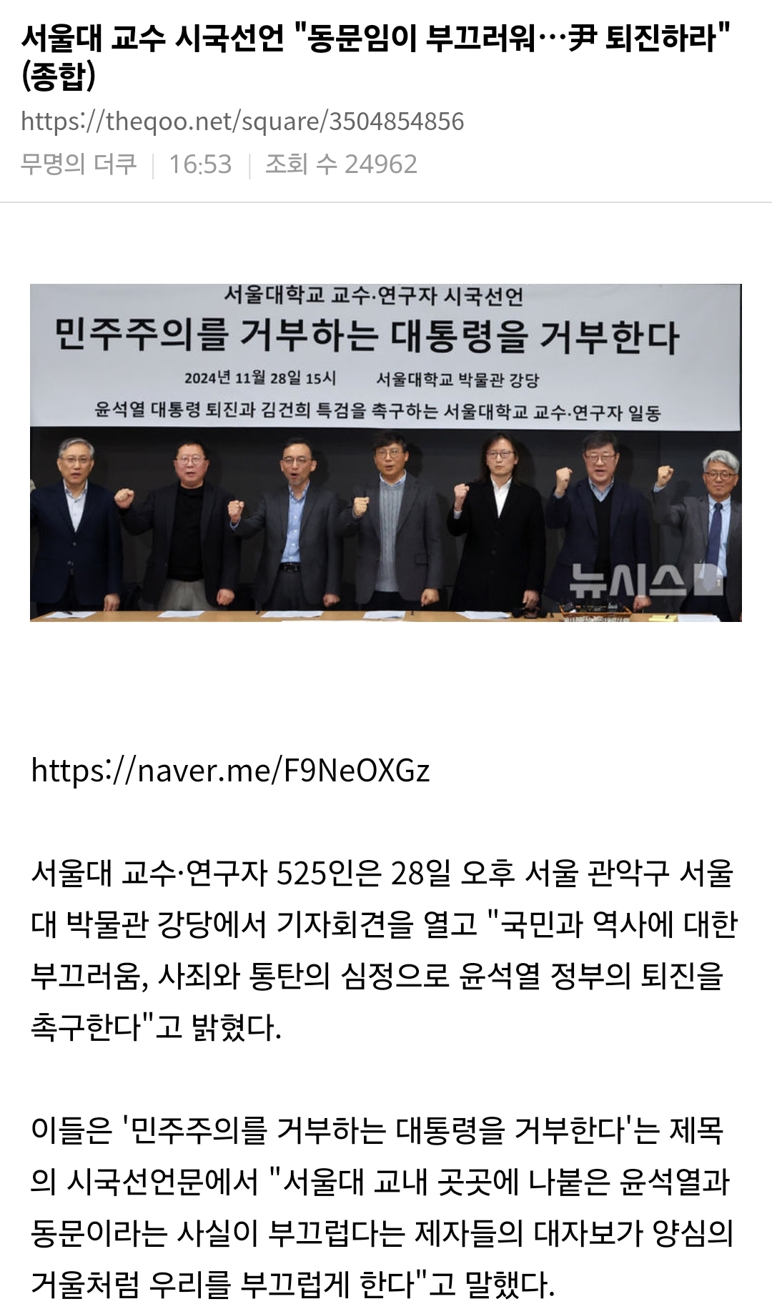 홍연우 오정우 기자 = 윤석열 대통령의 모교인 서울대학교 교수들이 윤 대통령의 퇴진을 요구하는 시국선언을 발표했다. 서울대 교수·연구자 525인은 28일 오후 서울 관악구 서울대 박물관 강당