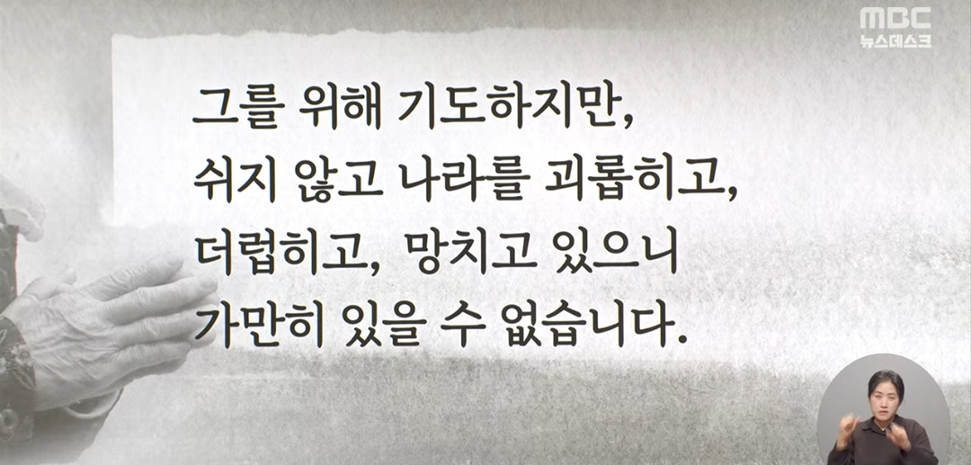 5. 그를 진심으로 불쌍하게 여기므로 그를 위해 기도합니다. 하지만 "그 사람 마음 안에서 나오는 나쁜 것들"(마르 7,21-22)이 잠시도 쉬지 않고 대한민국을 괴롭히고 더럽히고 망치고 있으니 가만히 있을 수 없습니다. 오천년 피땀으로 이룩한 겨레의 도리와 상식, 홍익인간과 재세이화의 본분을 팽개치고 사람의 사람됨을 부정하고 있으니 한시도 견딜 수 없습니다. 힘없는 사람들을 업신여기고 사회의 기초인 친교를 파괴하면서 궁극적으로 하느님을 조롱하고 하느님 나라를 거부하고 있으니 어떤 이유로도 그를 용납할 수 없습니다. 버젓이 나도 세례 받은 천주교인이오, 드러냈지만 악한 표양만 늘어놓으니 교회로서도 무거운 매를 들지 않을 수 없습니다.