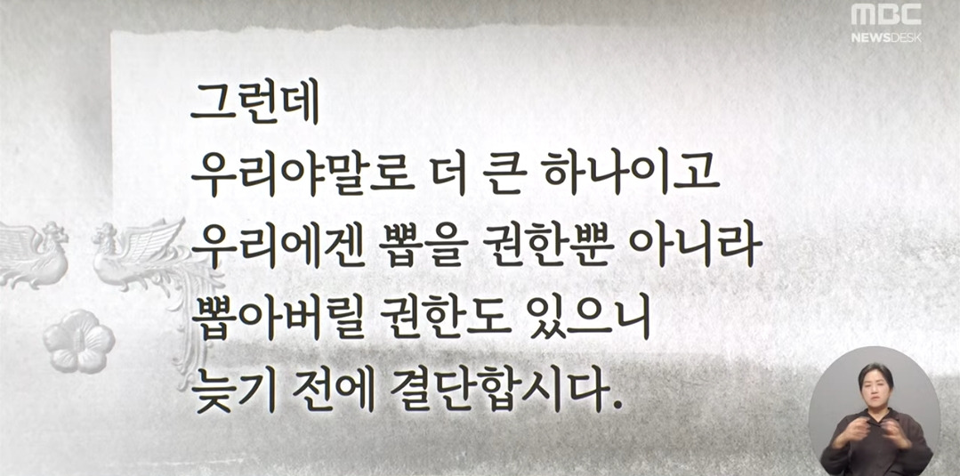 6. 그가 세운 유일한 공로가 있다면, ‘하나’의 힘으로도 얼마든지 '전체'를 살리거나 죽일 수 있음을 입증해 준 것입니다. 숭례문에 불을 지른 것도 정신 나간 어느 하나였습니다. 그런데 하나이기로 말하면 그이나 우리나 마찬가지요, 우리야말로 더 큰 하나가 아닙니까? 지금 대한민국이 그 하나의 방종 때문에 엉망이 됐다면 우리는 ‘나 하나’를 어떻게 할것인지 물어야 합니다. 나로부터 나라를 바로 세웁시다. 아울러 우리는 뽑을 권한뿐 아니라 뽑아버릴 권한도 함께 지닌 주권자이니 늦기 전에 결단합시다. 헌법준수와 국가보위부터 조국의 평화통일과 국민의 복리증진까지 대통령의 사명을 모조리 저버린 책임을 물어 파면을 선고합시다!