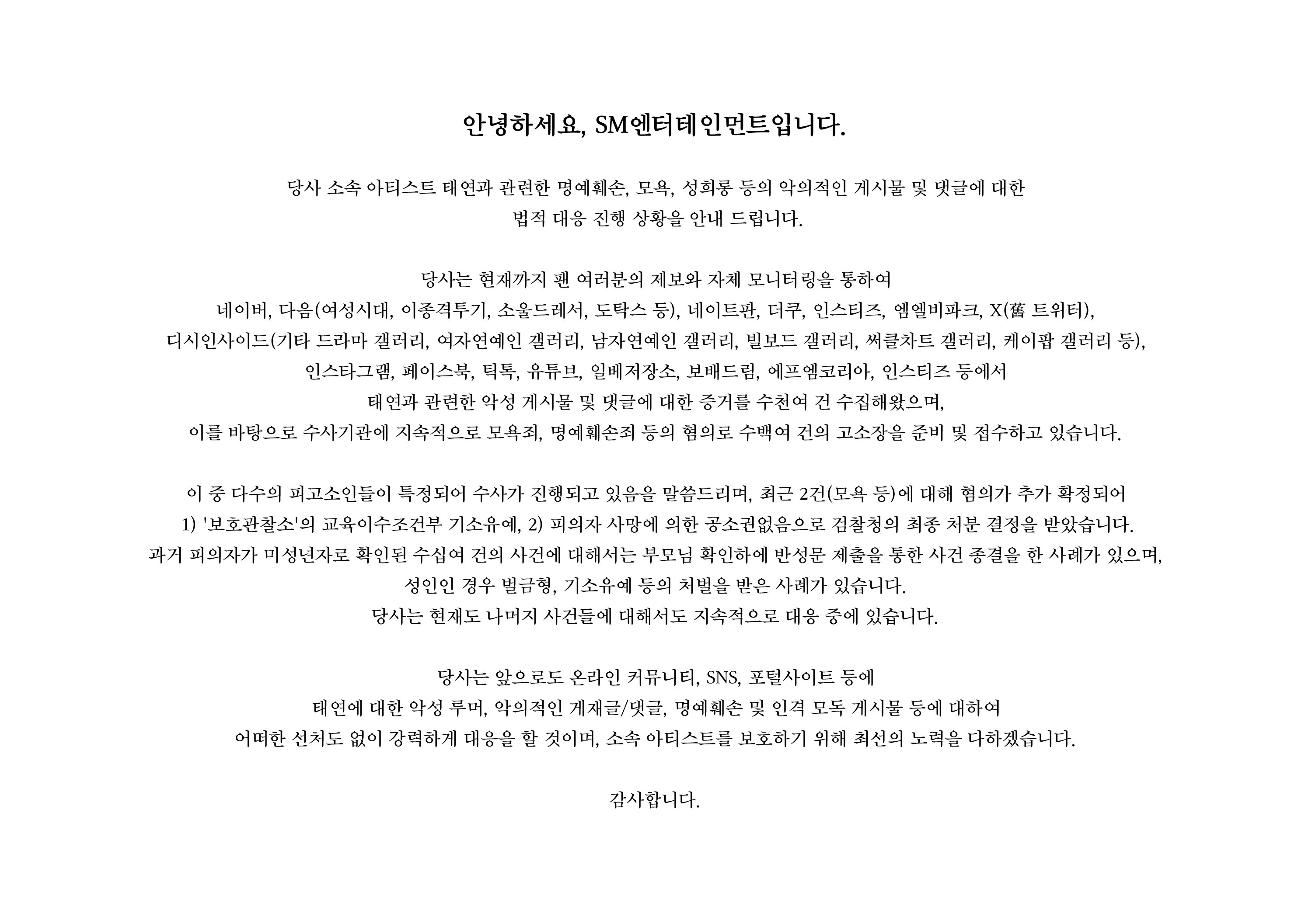 당사는 앞으로도 온라인 커뮤니티, SNS, 포털사이트 등에 태연에 대한 악성 루머, 악의적인 게재글/댓글, 명에웨손 및 인격 모독 게시불 등에 대하여 어떠한 선처도 없이 강력하게 대응을 할 것이며, 소속 아티스트를 보호하기 위해 최선의 노력을 다하겠습니다.