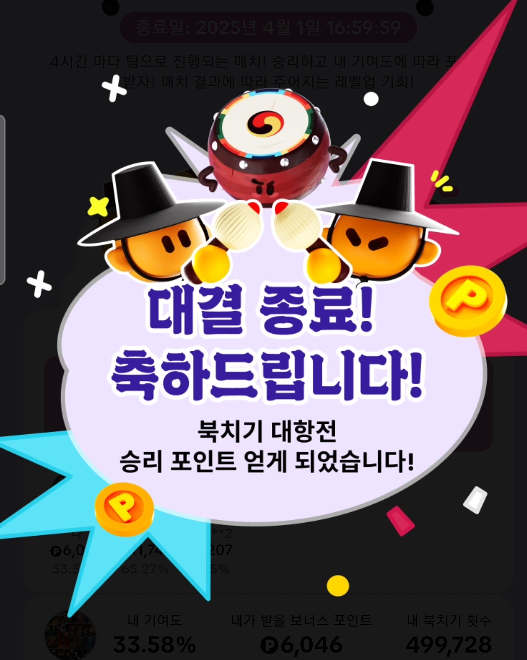 북치기대항전 종료 등급별 보너스 금액