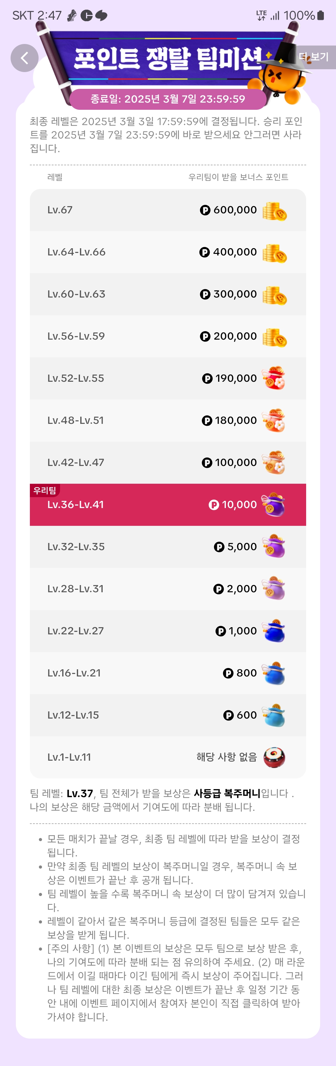 팀 레벨: Lv.37, 팀 전체가 받을 보상은 사등급 복주머니입니다 나의 보상은 해당 금액에서 기여도에 따라 분배 됩니다.