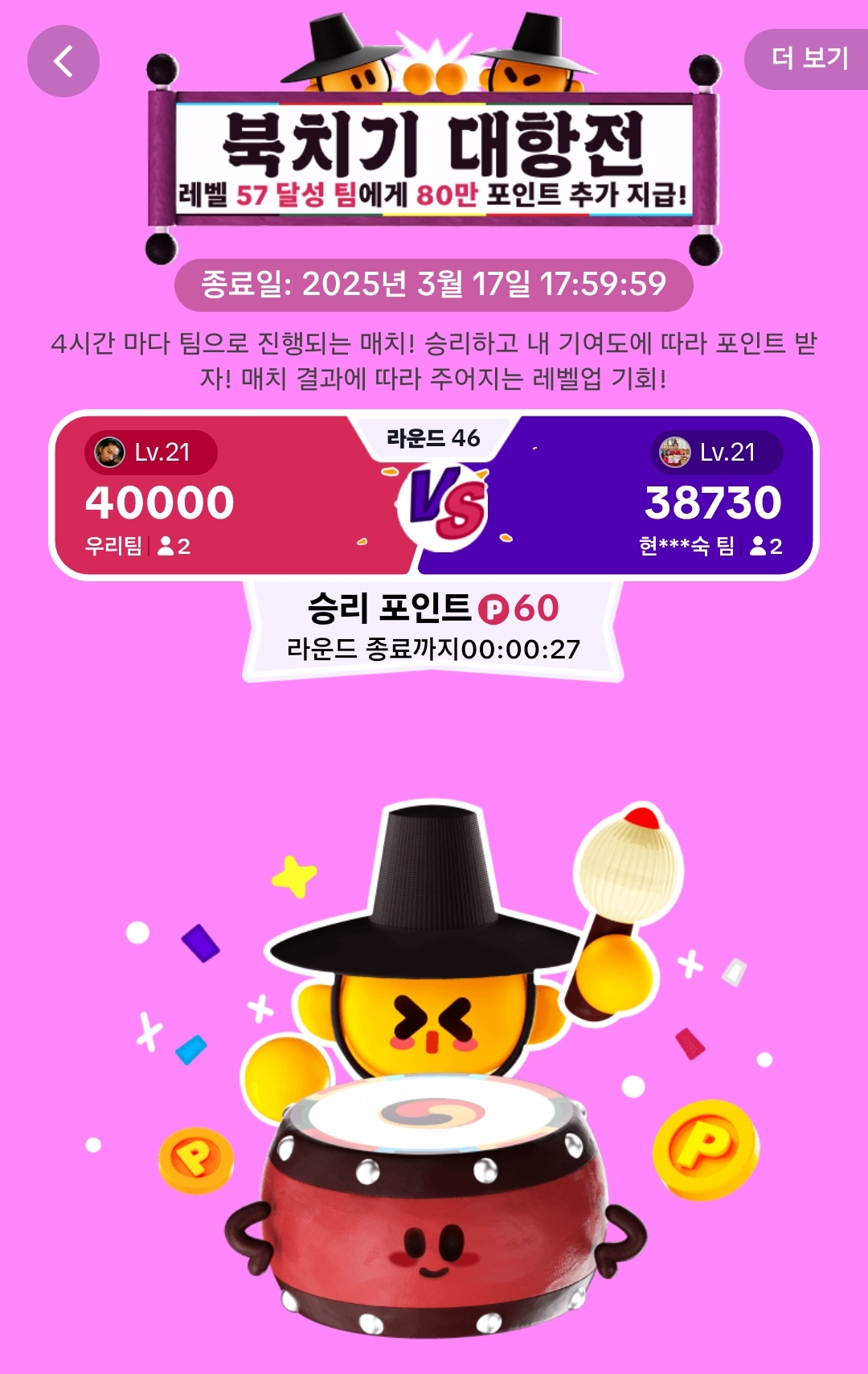 이벤트 기간 동안 사용자는 개인이 혼자서 혹은 친구와 함께 팀을 이뤄서 북치기 대항전에 참여할 수 있습니다. 대항전 라운드는 4시간 마다 시작되며, 최대 56 라운드까지 참여할 수 있습니다. 매 라운드는 시스템에서 자동으로 매칭을 진행시켜 줍니다. 매칭이 완료된 상대는 4시간 동안 이벤트 화면 중앙에 표시가 됩니다. 대항전이 시작되면 게임화면 가운데에 놓여진 북을 눌러 주세요. 누른 횟수만큼 북치기 횟수가 적용됩니다. 대항전 라운드가 종료되면, 우리팀과 상대팀 중에 북을 더 많이 친 팀이 승리하게 됩니다. 승패(무승부 포함) 결과에 따라 포인트를 받거나 팀 레벨업을 하게 됩니다(자세한 내용은 하단 '대항전 규칙'을 참고하여 주세요). 이벤트가 종료되면, 우리팀의 최종 레벨에 따라 추가 보너스 포인트를 받게 됩니다. 만약 보너스 포인트를 받게 될 경우, 2025년 3월 17일 18:00:00 - 2025년 3월 19일 24:00:00 기간 동안 포인트를 받으셔야 합니다. 해당 기간 동안 받지 않을 경우, 포인트는 자동으로 소멸됩니다.