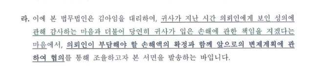 실제로 2차 내용증명을 보낸 다음 날인 3월 26일, 당사의 법률대리인은 당시 김새론 씨의 매니지먼트사와 소통하여 내용증명 우편의 취지를 설명하였습니다. 이에 김새론 씨는 2차 내용증명을 통해 “귀사가 지난 시간 의뢰인에게 보인 성의에 관해 감사하는 마음과 더불어 당연히 귀사가 입은 손해에 관한 책임을 지겠다는 마음에서, 내가 부담해야 할 손해액의 확정과 함께 앞으로의 변제계획에 관하여 협의를 통해 조율하고자 한다“라는 입장을 밝혔습니다.