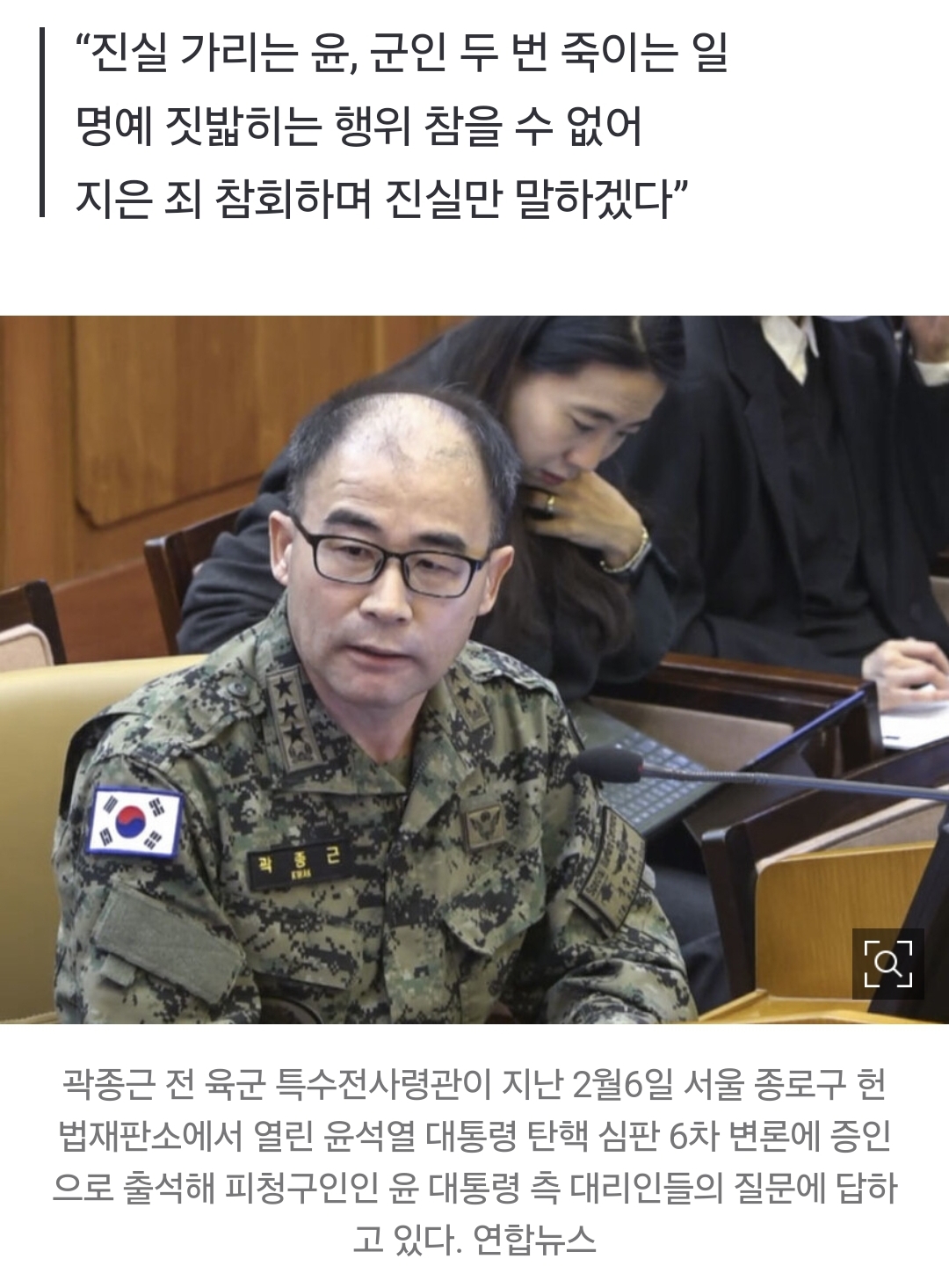 저는 비상계엄 작전에 참여하면서 그것이 위헌인지, 위법인지 판단하지 못했습니다. 지금 생각하니 그것이 저의 과오였습니다. 적어도 병사를 지휘하는 사령관이라면 위법 부당한 명령이 무엇인지 판단하고, 위법 부당한 명령이라면 제가 죽는 한이 있어도, 그것을 거부했어야 했습니다.