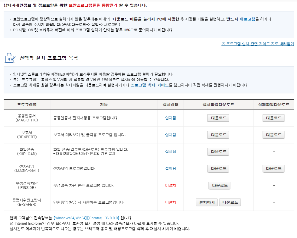 PC사양, OS 및 브라우저 버전에 따라 프로그램 설치가 안되는 경우 126으로 문의하시기 바랍니다.