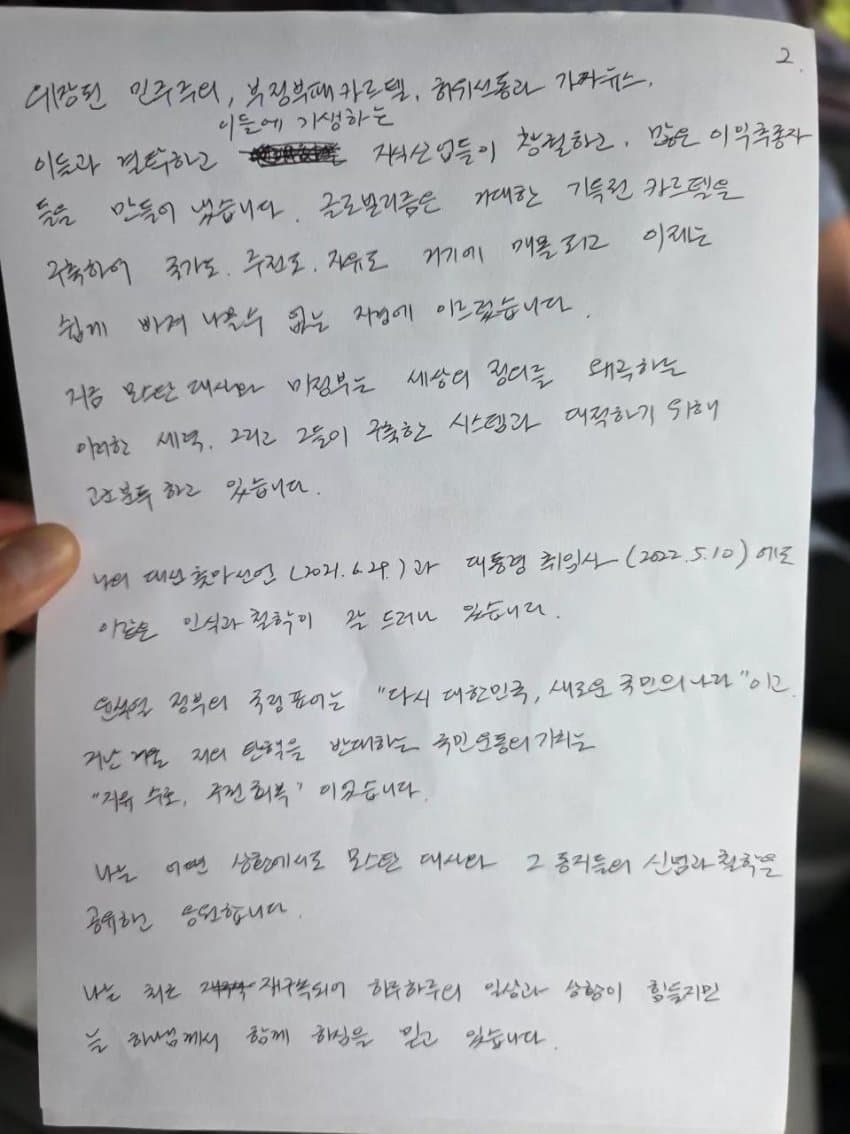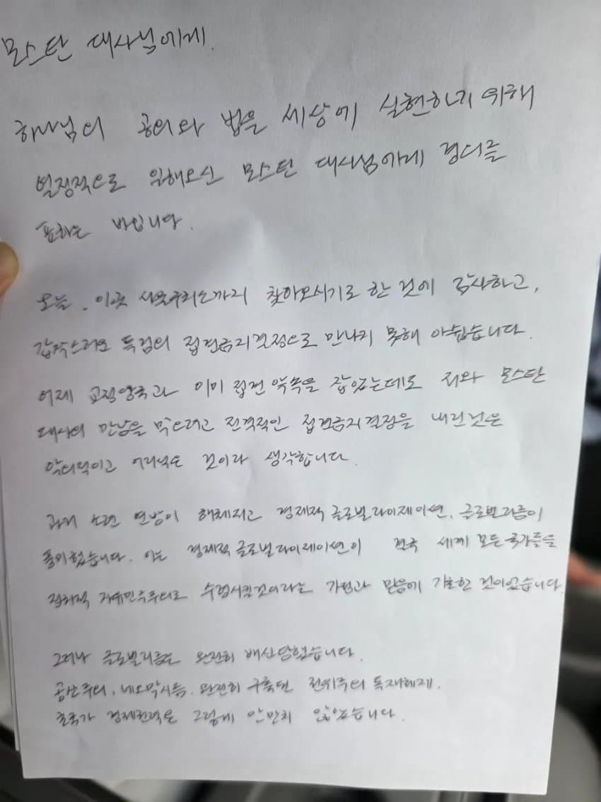 윤석열 전 대통령 옥중 서신 "모스 탄 대사님에게" 전문 자필 손편지 사진